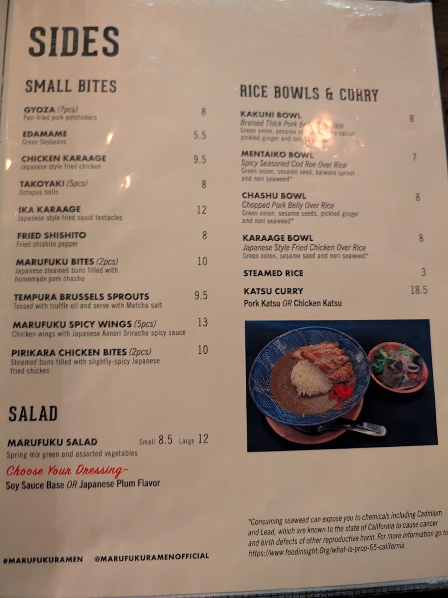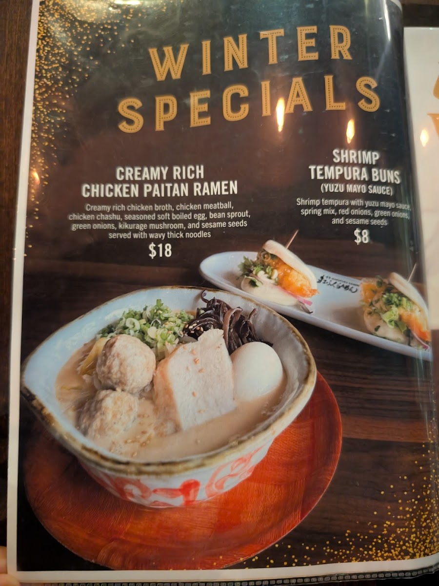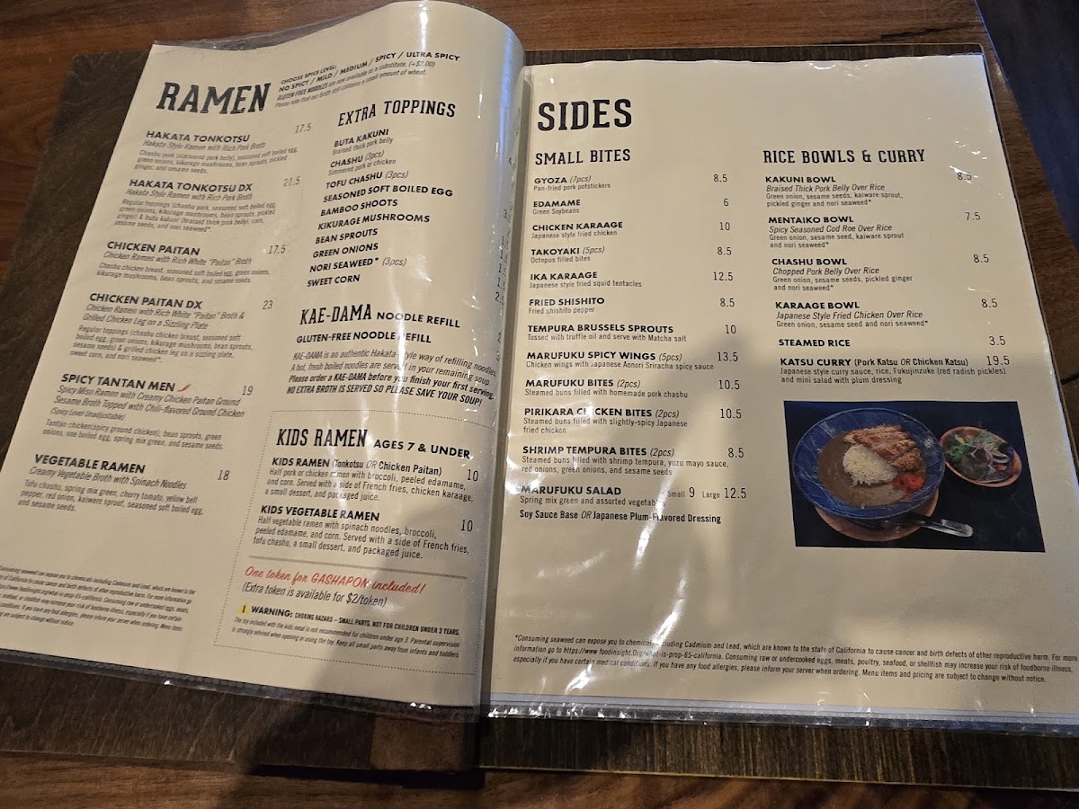 This ramen restaurant offers a focused menu centered around traditional and specialty ramen dishes, accompanied by various Japanese-inspired sides and bowls. The menu is divided into several main categories, including ramen, rice bowls, appetizers, and beverages.