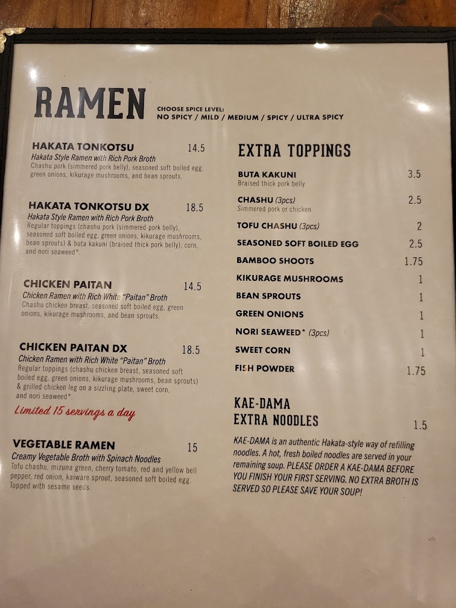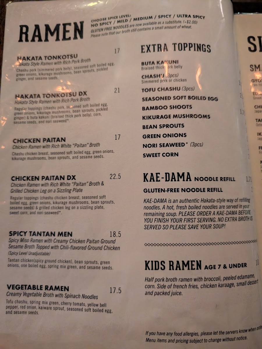 The ramen section features a variety of broths and toppings with options such as Hakata Tonkotsu Ramen, Spicy Miso Ramen, Chicken Paitan Ramen, and vegetable-based ramen. Gluten-free noodle substitutions are available at an additional cost, although the broth contains a small amount of wheat. Each ramen dish typically includes elements like chashu pork, soft-boiled eggs, mushrooms, and green onions, with spice powders served on the side for customization.